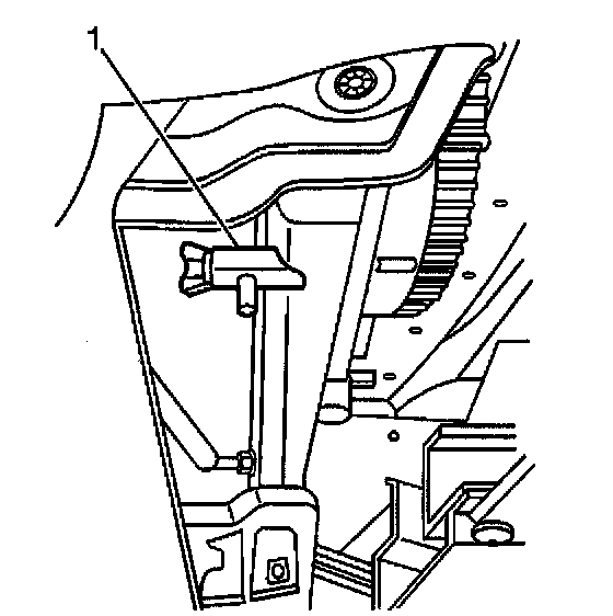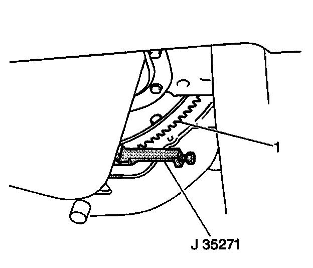 17. Install the torque converter bolts on automatic transmission equipped vehicles. Use the J35271 in order to lock the flywheel (1).