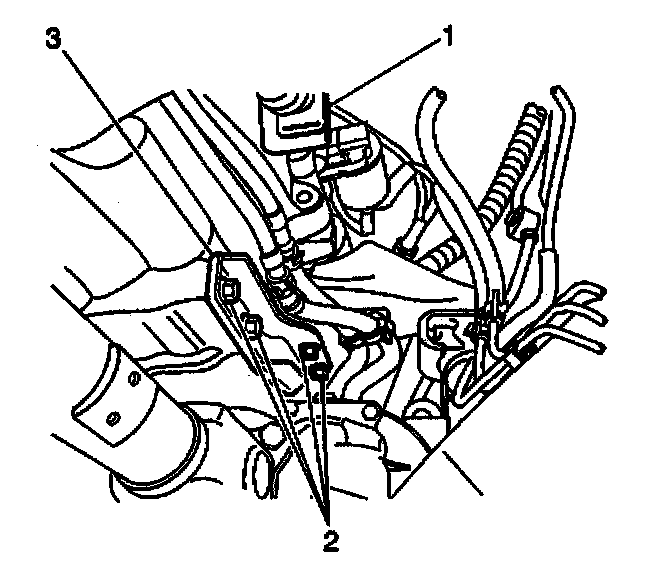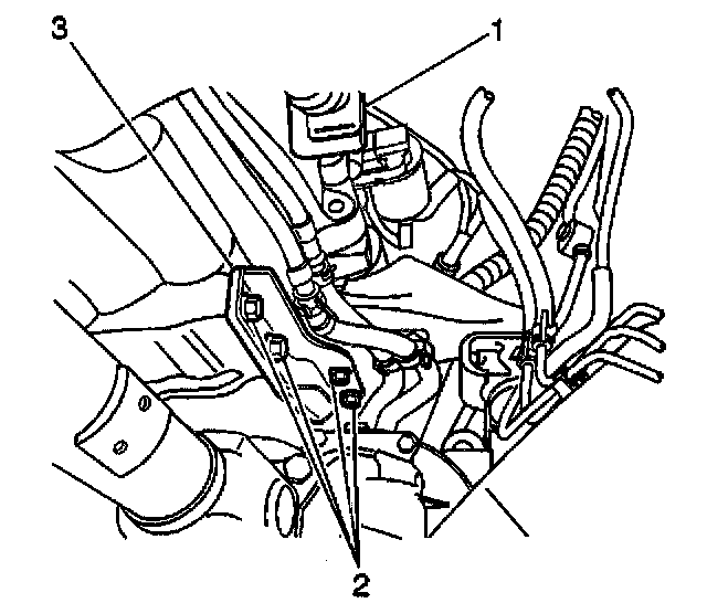 17. Remove the 3 bolts (1) and the A/C compressor, if equipped, from its bracket and position aside. Refer to Compressor Replacement.