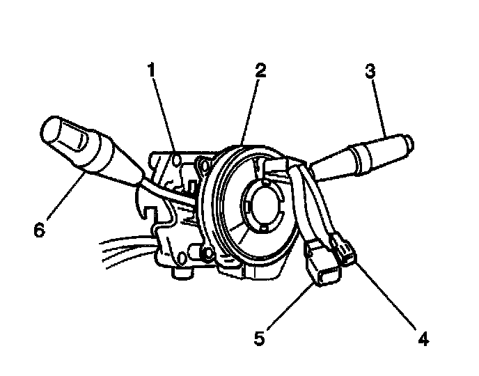 The headlamp dimmer switch is not individually replaceable. In order to replace the headlamp dimmer switch, replace the turn signal and headlamp and windshield wiper and windshield washer switch with the inflatable restraint steering wheel module coil (1). Refer to Inflatable Restraint Steering Wheel Module Coil Replacement in SIR.