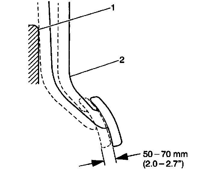 3. Depress the clutch pedal (2) to within 20 to 30 mm (0.8 to 1.2 inch) from the floor (1).