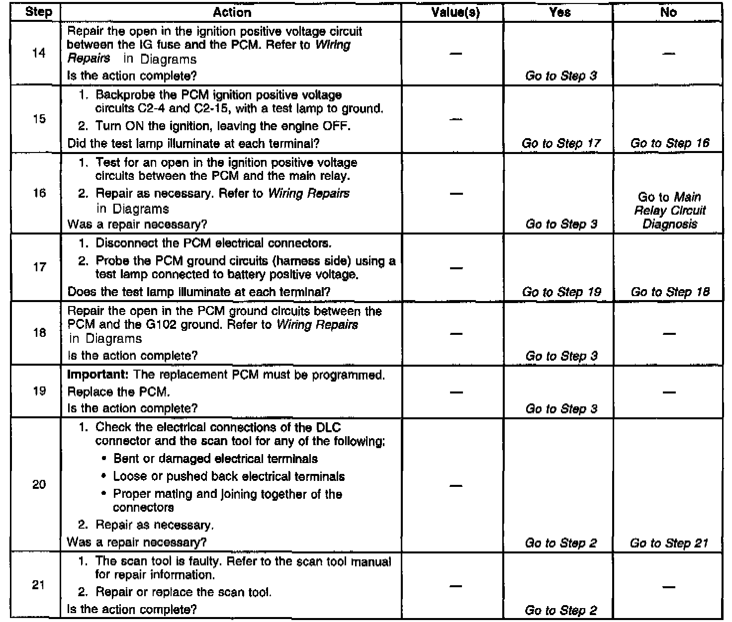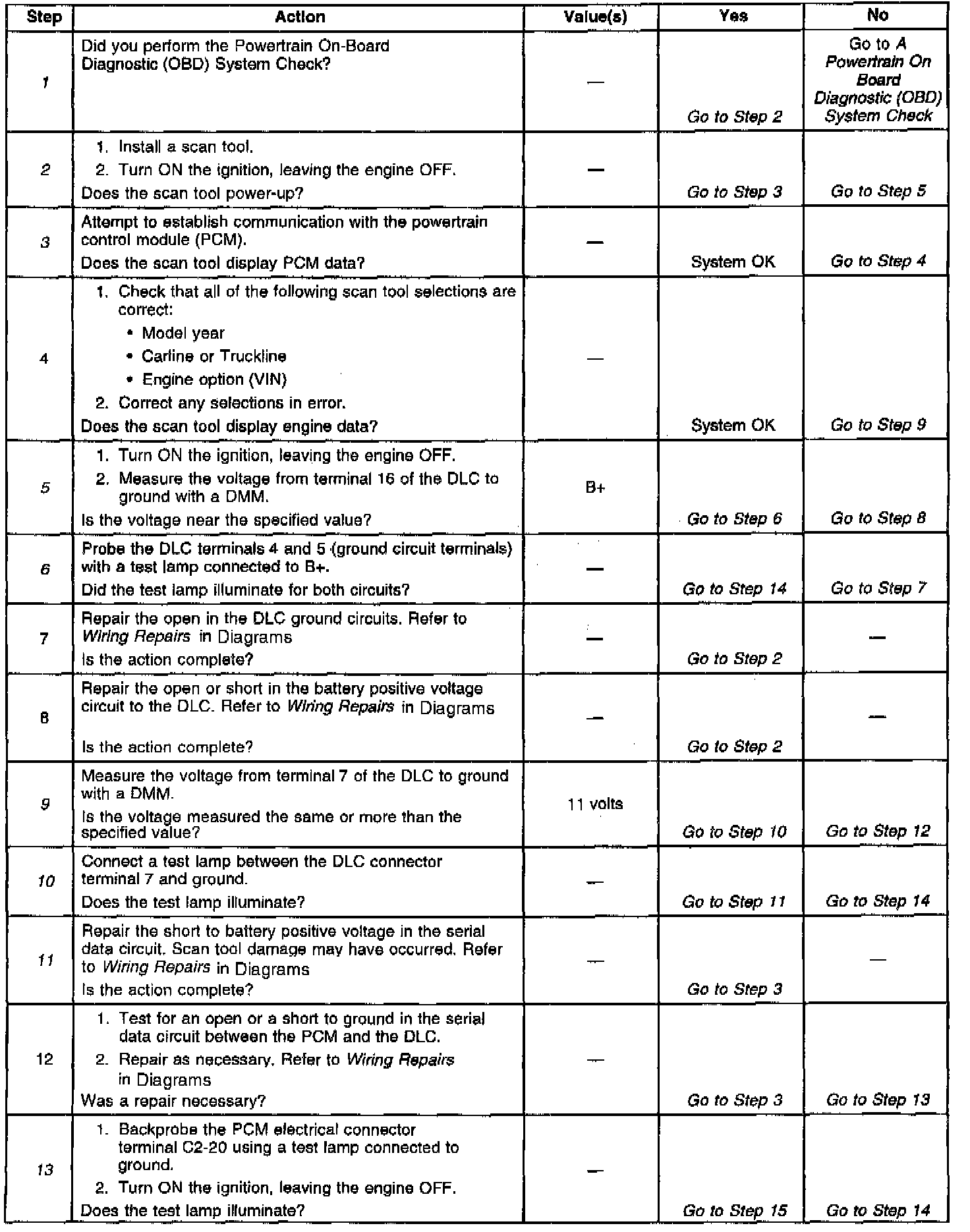 13. This step checks for voltage in the ignition positive voltage circuit that supplies the PCM. An open in this circuit will disable the PCM and the main relay. The PCM will not provide serial data if the circuit is open.