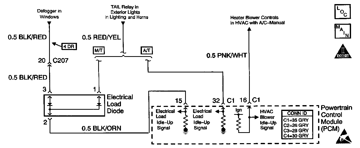 The Powertrain Control Module (PCM) receives electrical load idle-up signals from the HVAC blower motor, exterior lighting, and the rear window defogger circuits. When the electrical load idle-up signal is present, the PCM increases the Idle Air Control (IAC) valve opening. Increasing the IAC valve opening enables the engine to maintain the idle speed necessary to compensate for the additional electrical load. The idle-up signal of the rear window defogger circuit (4-door vehicles only) passes through an electrical load diode. The electrical load diode is located below the glove box, behind the PCM.