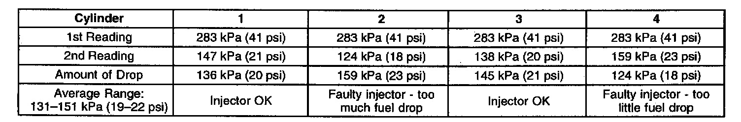 7. The fuel injectors are flowing properly if the pressure drop value for each fuel injector is within 13 kPa (2.0 psi) of the average pressure drop value. Calculate the pressure drop value for each fuel injector by subtracting the second pressure reading from the first pressure reading. Refer to the examples in the preceding table.