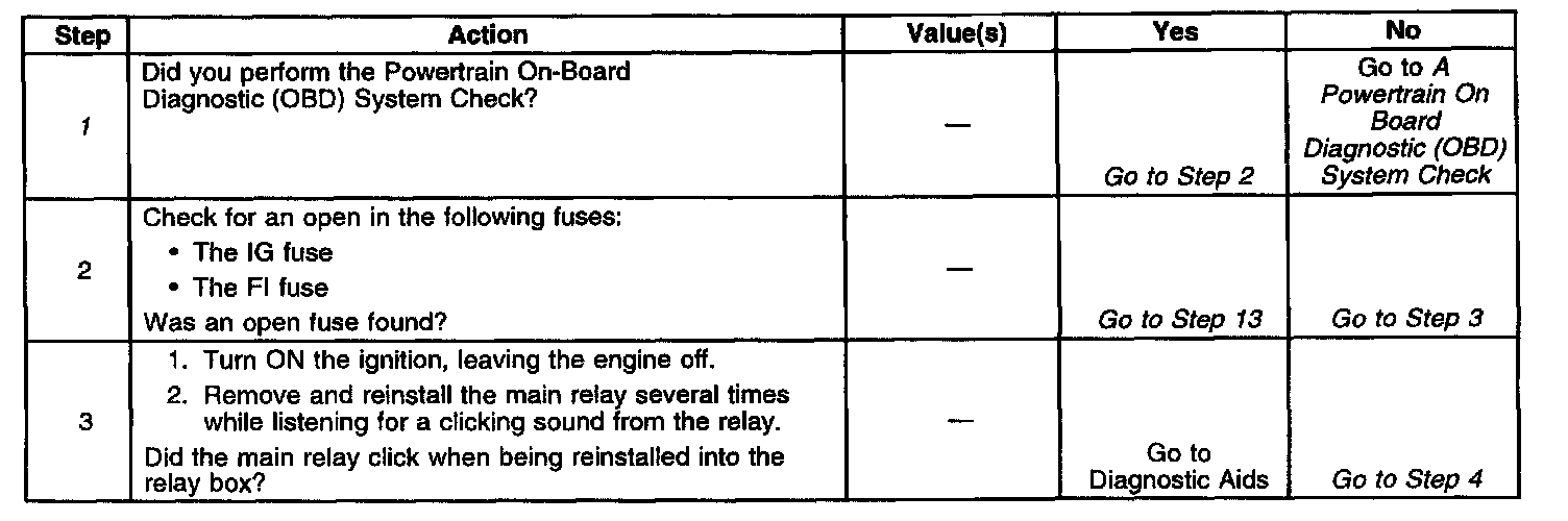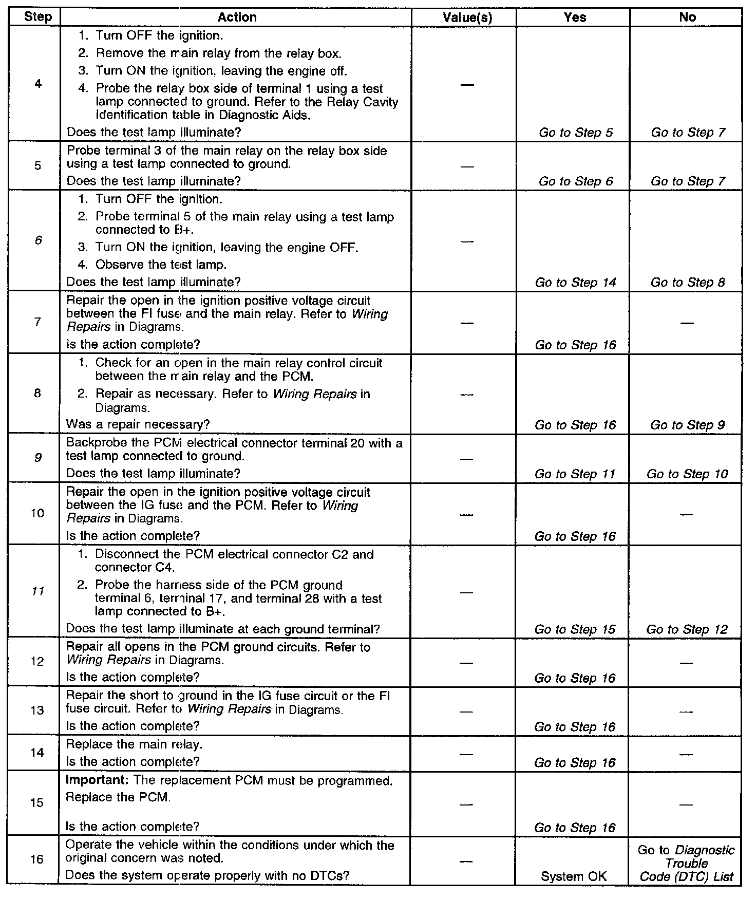 9. This step checks for ignition positive voltage at the PCM. The PCM will not operate the main relay if there is no power to terminal 20.