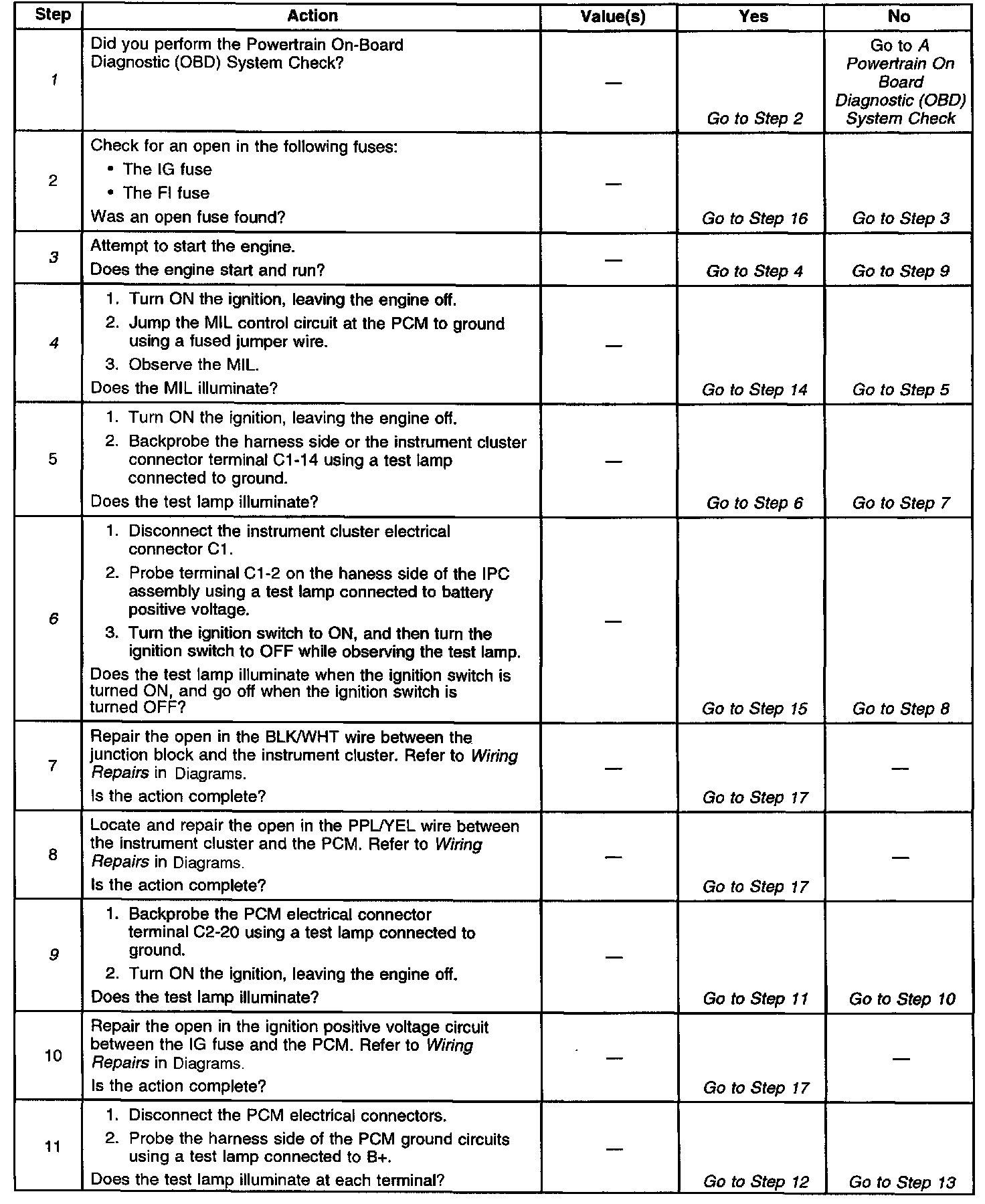 9. This step checks for an open in the ignition positive voltage circuit that supplies the PCM. An open in this circuit will disable the PCM and the main relay. The engine will not start or run, and there will be no MIL control or serial data if the circuit is open.
