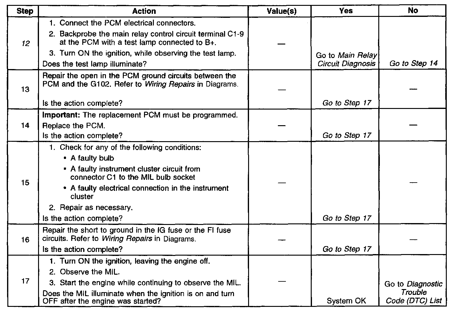 12. This step tests for whether the PCM is turning ON the main relay. The MIL will not illuminate if the main relay is malfunctioning.