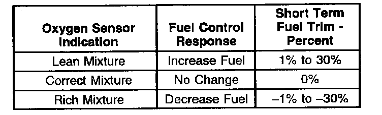 The short term fuel trim is used by the Powertrain Control Module (PCM) in order to control the fuel injector pulse width. When the fuel metering control system is in closed loop operation, the PCM monitors the fuel trim oxygen sensor signal, in order to determine if the fuel system is operating rich or lean. If the PCM determines that no change in fuel delivery is needed in order to maintain the correct air/fuel ratio for a particular engine operating condition, a short term fuel trim scan tool data value of 0 percent is indicated. If the control module determines that the fuel system is operating rich, short term fuel trim will compensate for the rich condition by decreasing the fuel injector pulse width. When this happens, the scan tool will indicate a short term fuel trim value of less than 0 percent. If the PCM determines that the fuel system is operating lean, short term fuel trim will compensate for the lean condition by increasing the fuel injector pulse width. In this case the scan tool will indicate a short term fuel trim value of more than 0 percent.