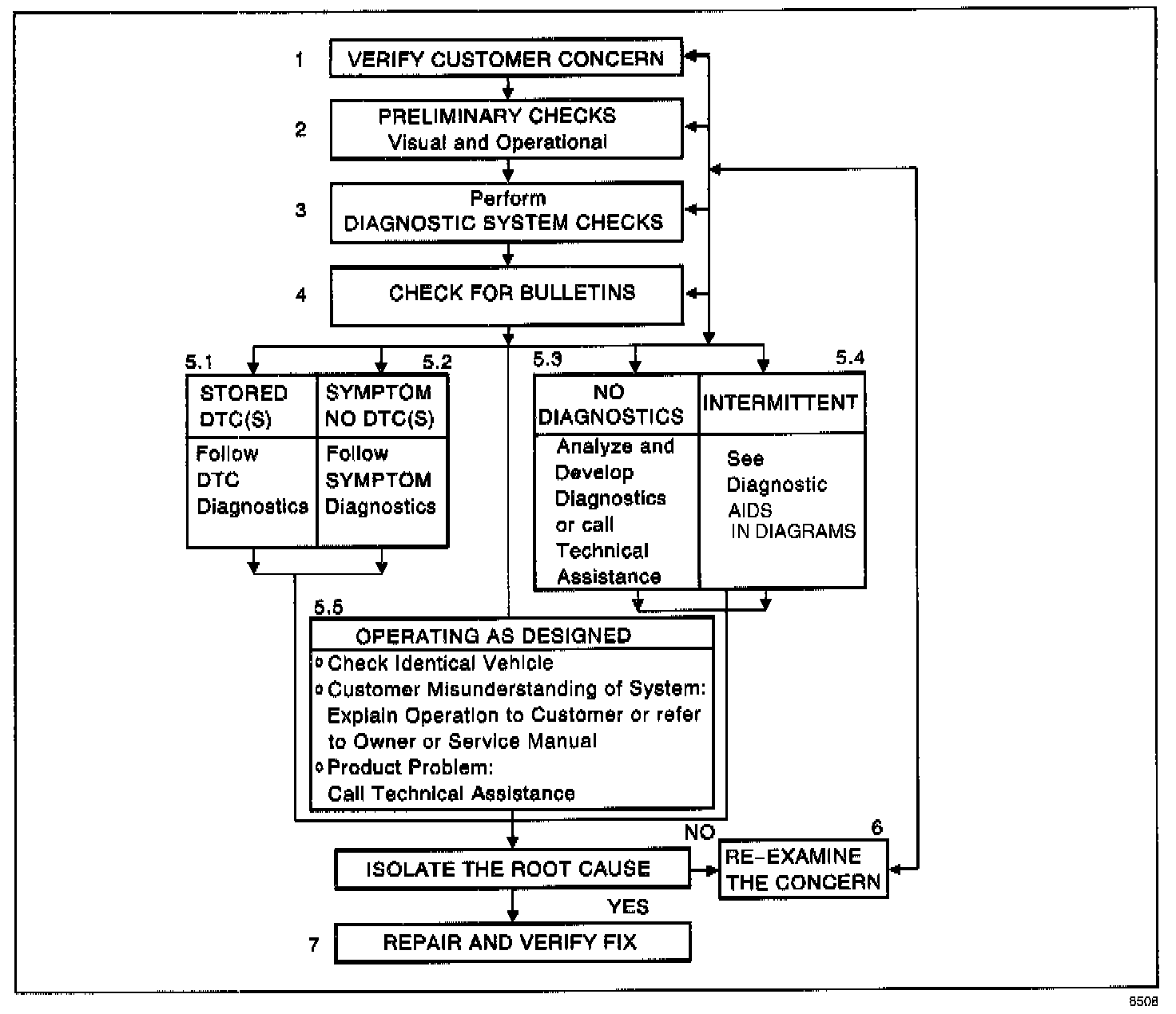 The goal of Strategy Based Diagnostics is to provide guidance when you create a plan of action for each specific diagnostic situation. Following a similar plan for each diagnostic situation, you will achieve maximum efficiency when you diagnose and repair vehicles. Although each of the Strategy Based Diagnostics boxes is numbered, you are not required to complete every box in order to successfully diagnose a customer concern. The first step of your diagnostic process should always be, Verify the Customer Concern (box 1). The final step of your diagnostic process should be, Repair and Verify the Fix (box 7). Refer to the following chart for the correct strategy based diagnostics.