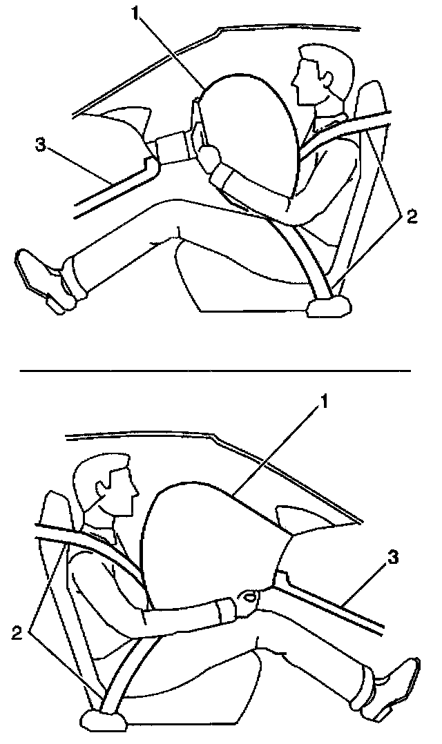 The Supplemental Inflatable Restraint (SIR) system supplements the protection offered by the driver and front passenger seat belts (2). The SIR system deploys an air bag (1) from the center of the steering wheel and from the right side of the instrument panel.