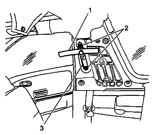 1. Install the front seat belt shoulder belt retractor tension adjuster (3) to the vehicle. Secure the adjuster with the 2 bolts (2).