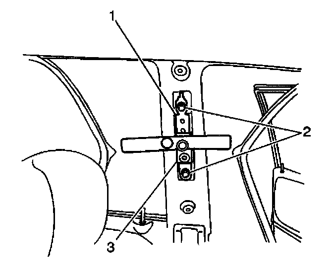 1. Install the front seat belt shoulder belt retractor tension adjuster (1) to the vehicle. Secure the adjuster with the 2 bolts (2).