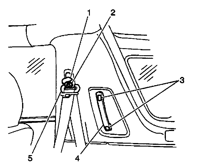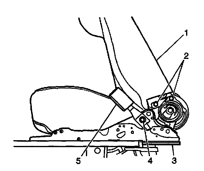 1. Install the front seat belt buckle (5) to the front seat inner adjuster (3). Secure the buckle with the anchor bolt (4).