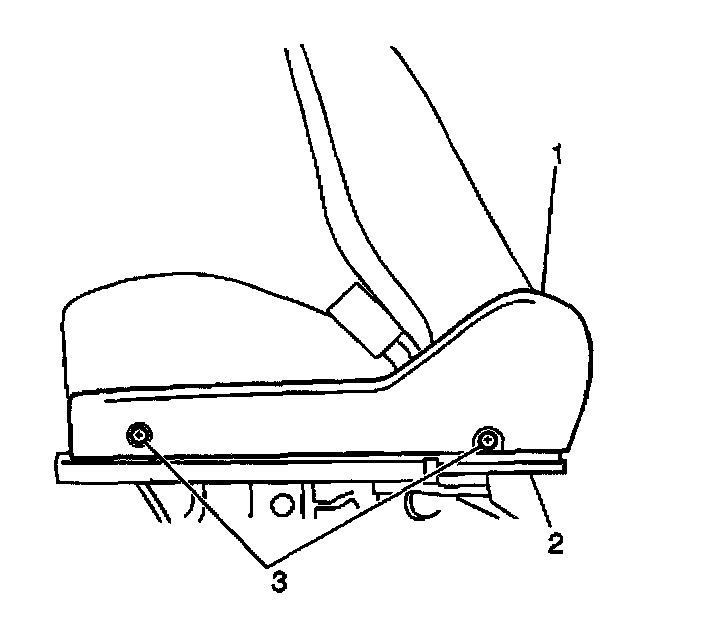 3. Install the front seat inner adjuster finish cover (1) to the front seat inner adjuster (2). Secure the finish cover with the 2 screws (3).