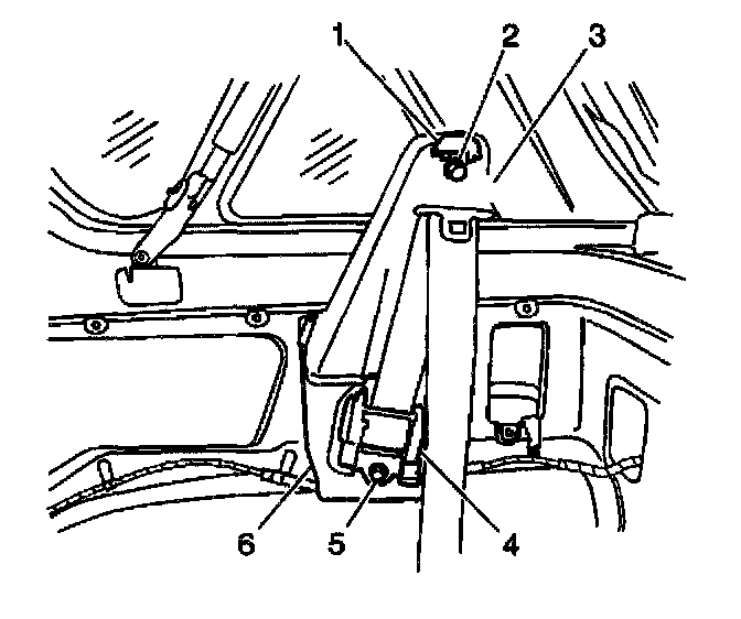 3. Remove the shoulder guide anchor bolt (2) which secures the rear seat belt to the rear seat belt mounting bracket (6).