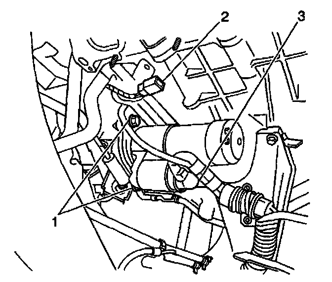 2. Install the starter upper mounting bolt (1) and the ground wire.