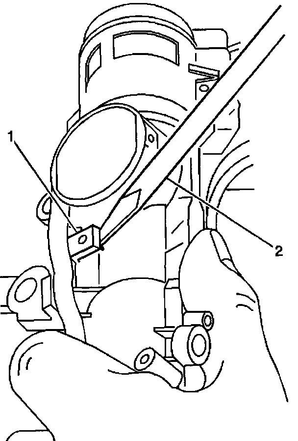 17. Using compressed air and a blow gun (2), remove any debris from the hole (1) in the lock cylinder that was covered by the AT cover.