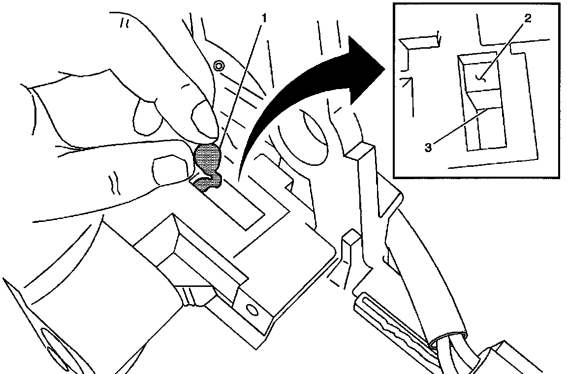 26. With the ignition key in either the ON or ACCESSORY position, by hand, move the AT lever in (1) and out (3) of the slot (2) in the AT cover. Verify that it moves freely in and out of the AC cover slot at least 5 times.