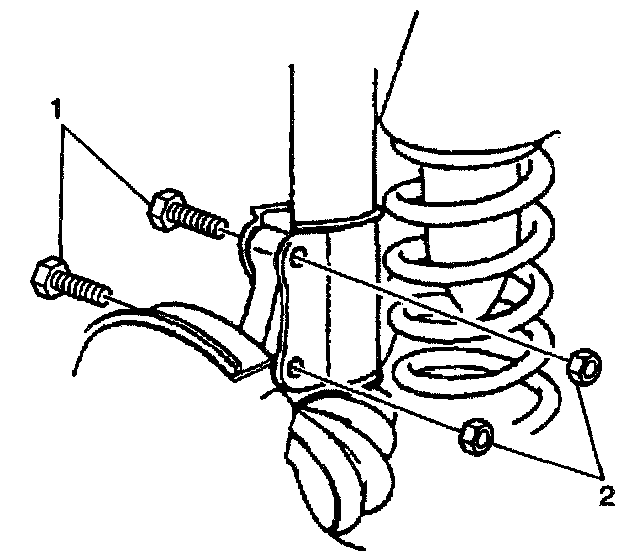 12. Remove the 2 nuts (2) and the 2 bolts (1) from the strut bracket.