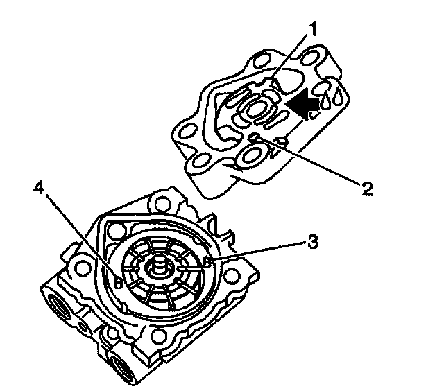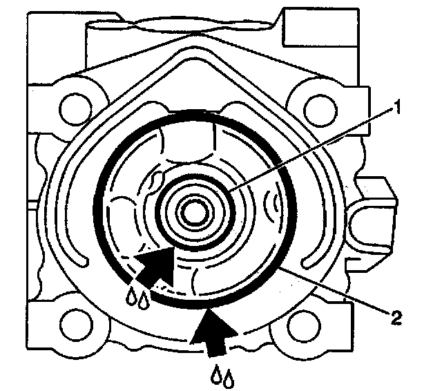 4. Apply DEXRON (R)-III Automatic Transmission Fluid, GM P/N 12346143, or equivalent, to the O-rings and fit the O-rings (1,2) to the pump body.