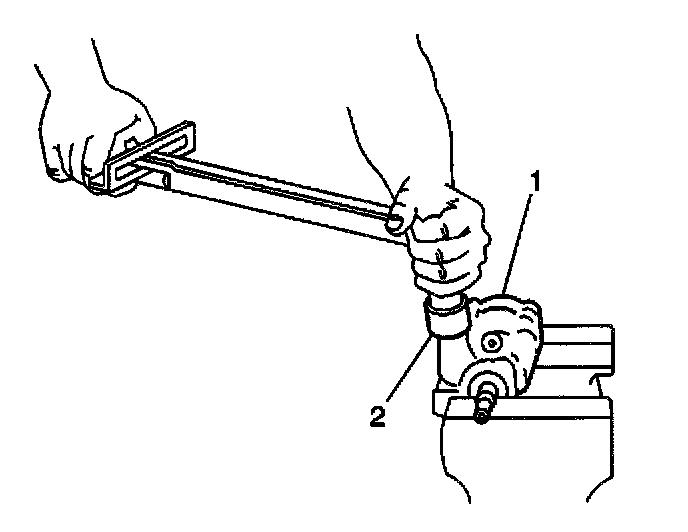 28. Install the power steering gear outlet hose connector (1) to the pump body (2).