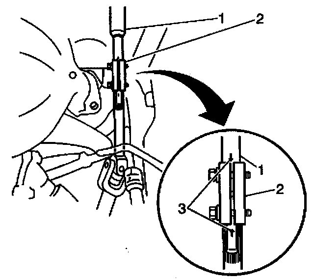 4. Using paint, place match marks (3) on the steering column shaft (1) and the lower steering shaft in order to mark the location of the opening in the steering shaft coupling (2).