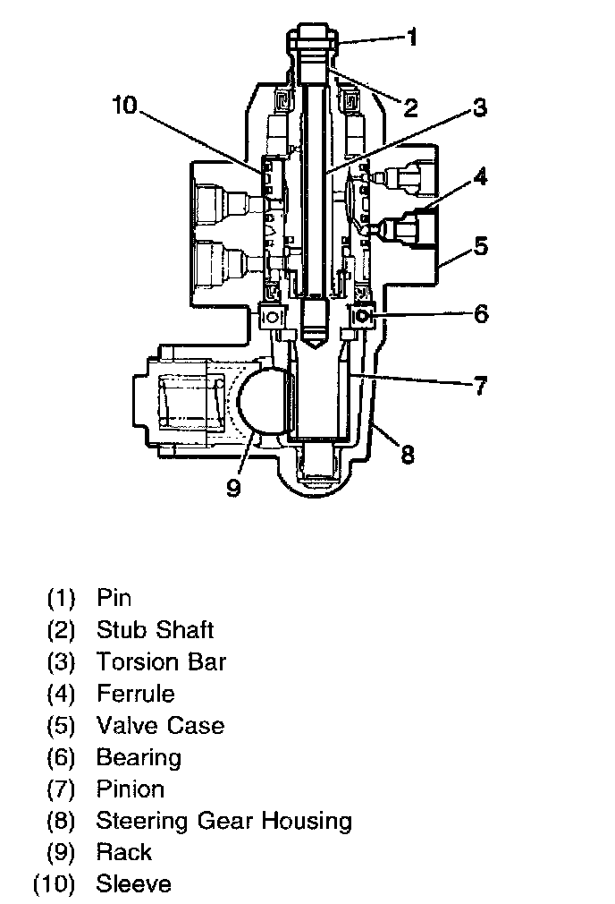 The steering gear consists of a cylinder section and a valve section. The main components of the cylinder section are the gear housing, the rack, and the tube. The main components of the valve section are the valve case, the pinion, the sleeve, and the stub shaft. The pinion and the stub shaft are linked to each other by the torsion bar.