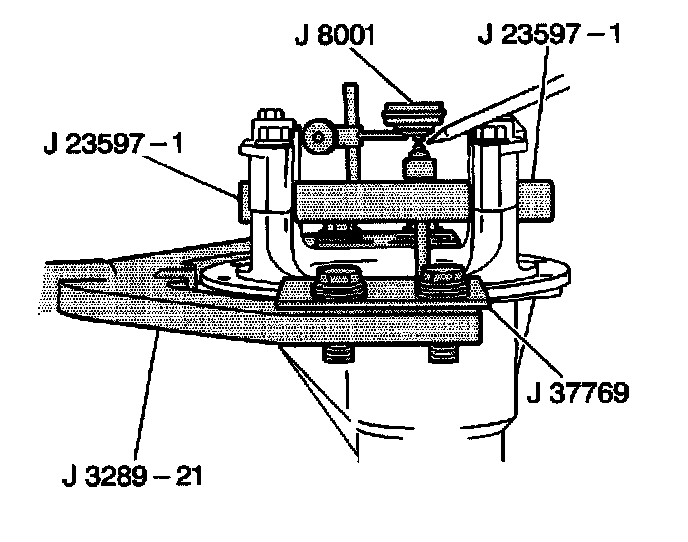 13. Slowly rotate the J 23597-1 back and forth so that the spring loaded plunger extension sweeps back and forth across the 97 mm level of the J 21777-102 with the J 43847 while observing the dial indicator.