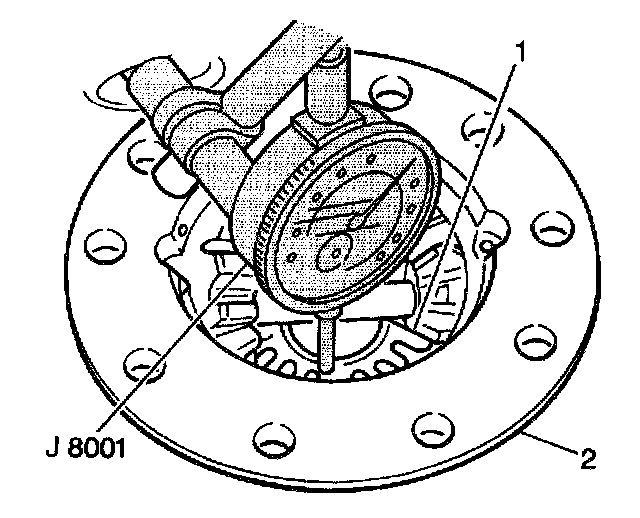 2. Measure the right differential side gear (1) end play using the J 8001.