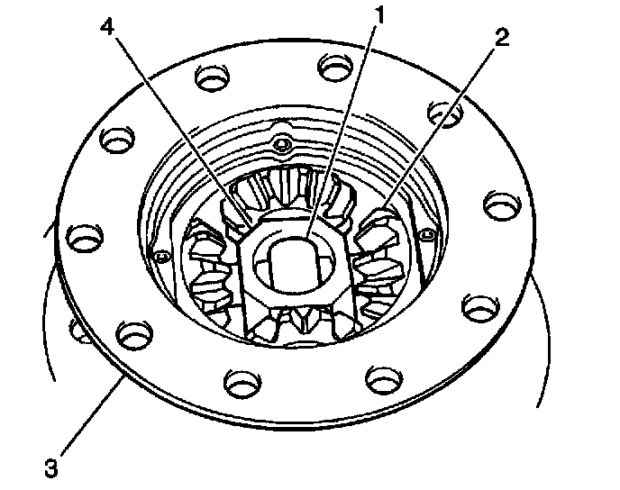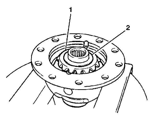 6. Install the left differential side gear (1) and washers (2) into the right differential case.