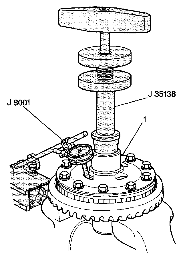 12. Move the J 35138 up and down while observing the J 8001. The left differential side gear end play should measure 12 to 37 mm (0.005 to 0.014 inch).
