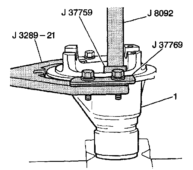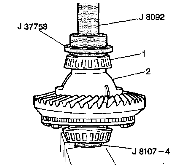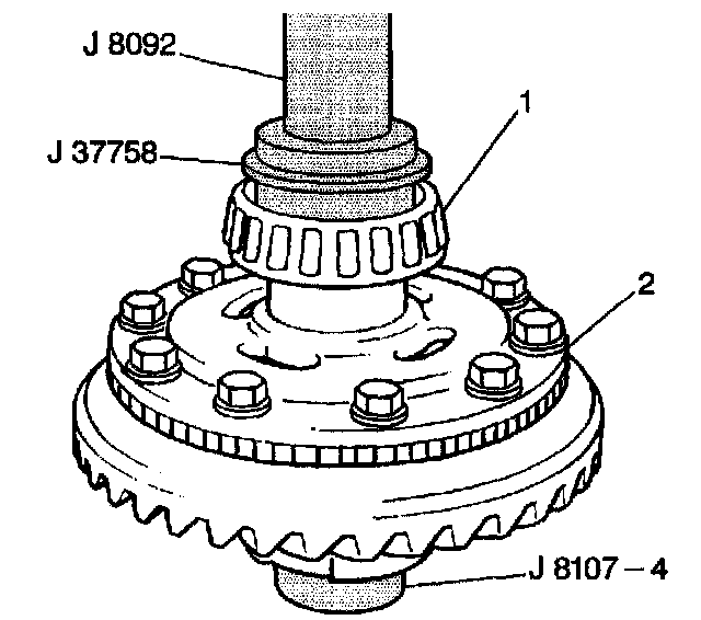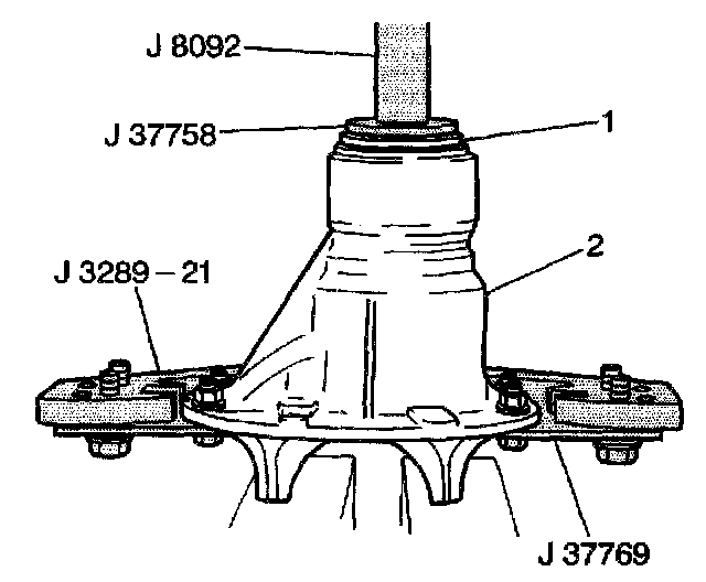 30. Install the outer pinion bearing race (1) using the J 37758 with the J 8092.