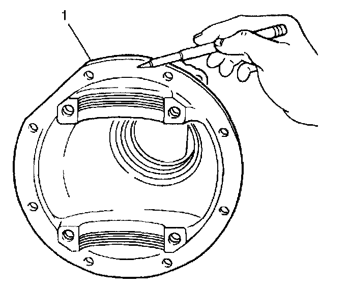 15. Remove the outer pinion bearing races (1) from the differential carrier using a large drift punch and a hammer. Tap around the rear of each bearing race and slowly drive each race out evenly.