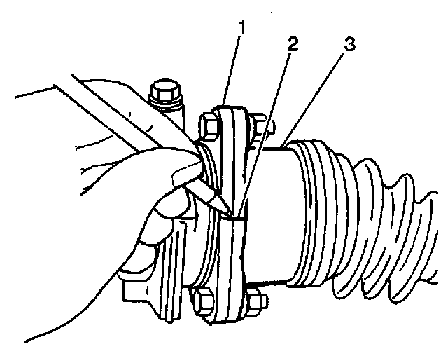 2. Install the differential side joint flange of drive axle shaft to the inner axle shaft flange. Be sure to align the reference marks (2) on the inner axle shaft flange (1) and the differential side joint flange (3) of the drive axle shaft.