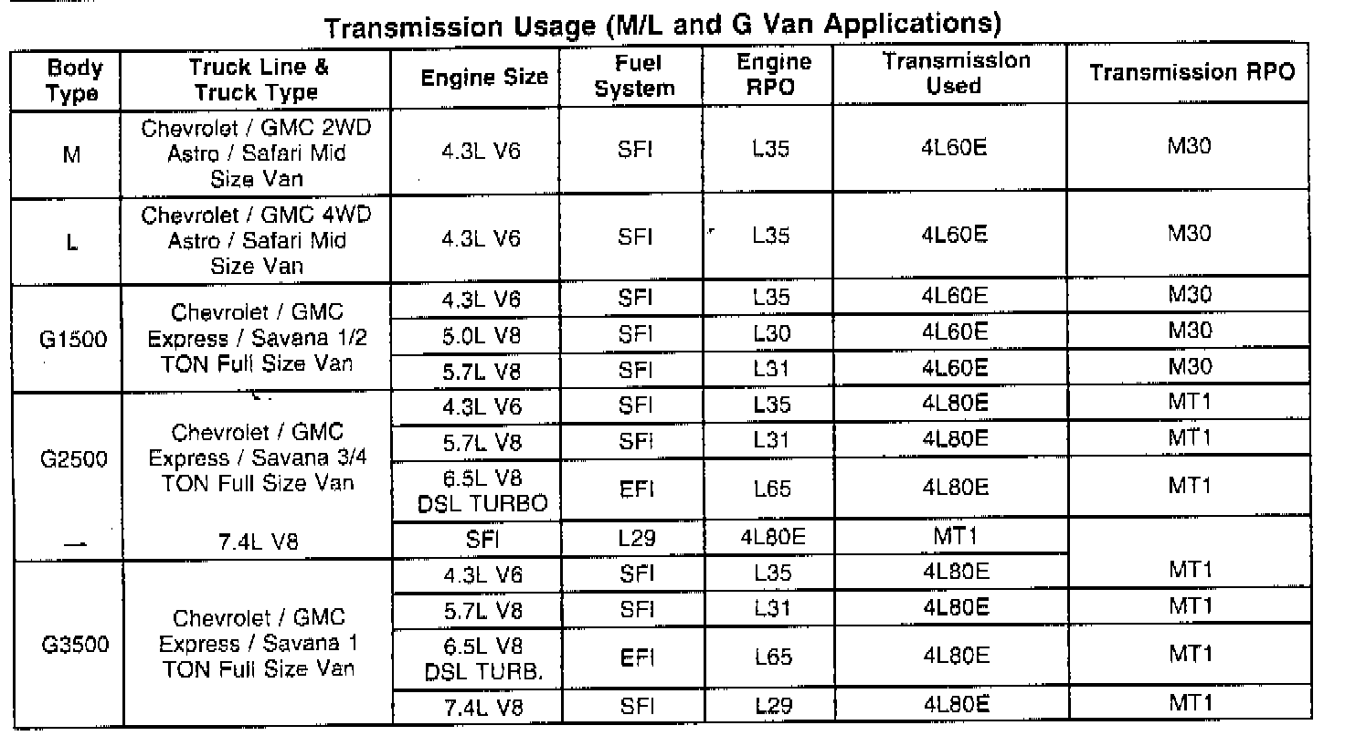 Transmission Usage (M/L And G Van Applications):