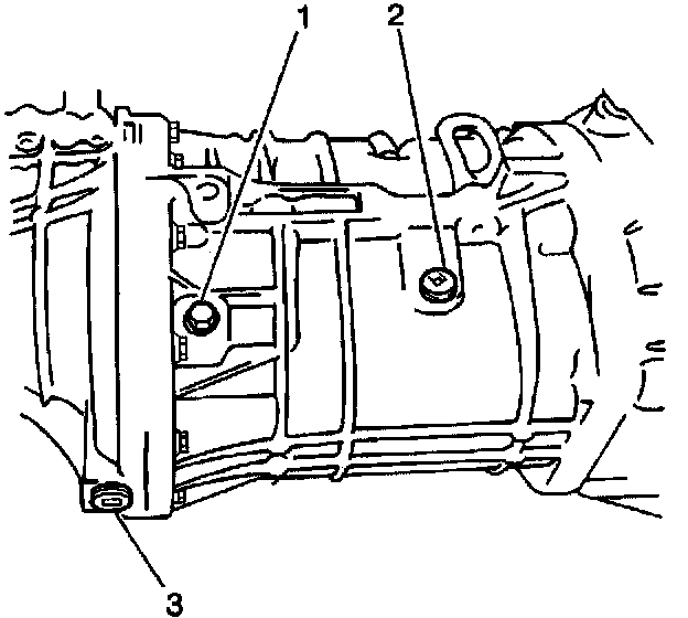 8. Pour approximately 1.5 liters (1.6 qts) of GM Goodwrench Synthetic Manual Transmission Fluid, (GM P/N 12346190) or equivalent SAE 75W-90 GL-4 Gear Oil into the transmission oil level/filler plug (2) hole. Oil level should be even with the bottom of the transmission oil lever/filler plug hole.