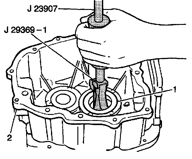 1. Use the J 29369-1 with the J 23907 in order to remove the rear case oil seal (1) from the rear case.