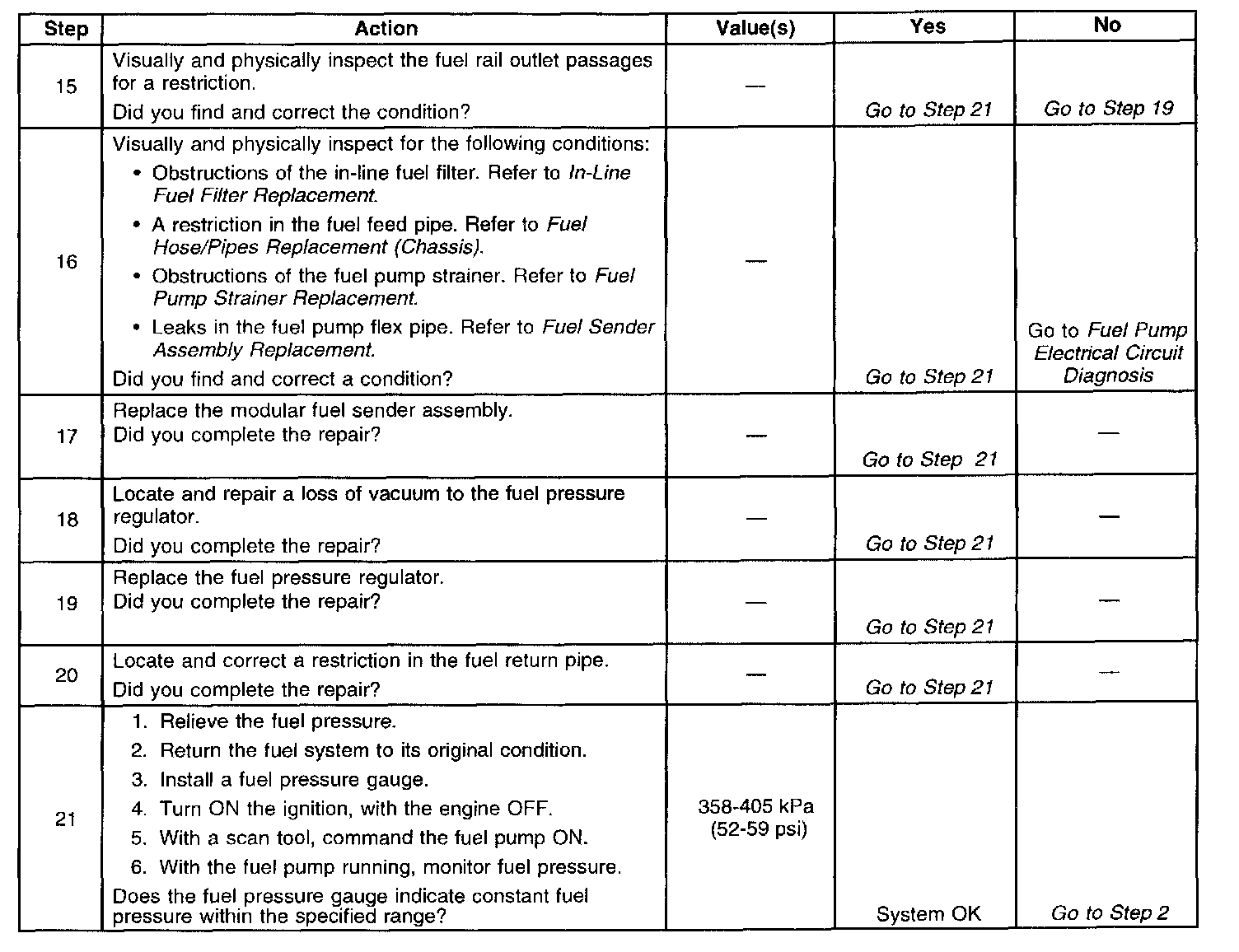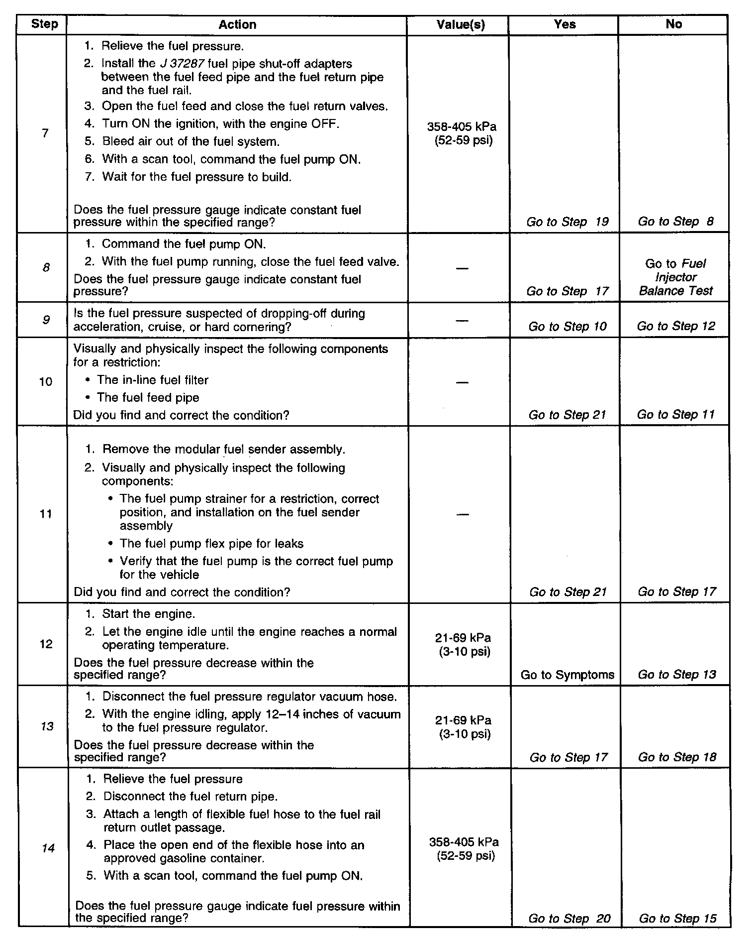 14. This test determines if the high fuel pressure is due to a restricted fuel return pipe or fuel pressure regulator. A rich condition may cause a DTC P0132 or DTC P0172 to set. Driveability conditions associated with rich conditions can include hard starting (followed by black smoke) and a strong sulfur smell in the exhaust.