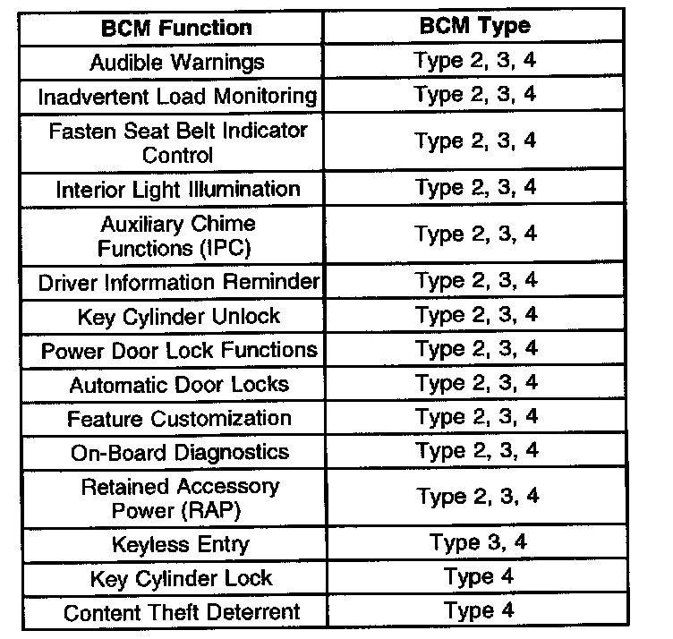 This vehicle is equipped with 1 of 3 types of BCMs. The BCM type installed on this vehicle is based on the vehicle equipment, point of sale, and option content. Refer to On-Board Diagnostic Features for more information on how to identify the BCM type installed by using the on-board diagnostic feature. The following identifies the functions and basic option content of all 3 BCM types: