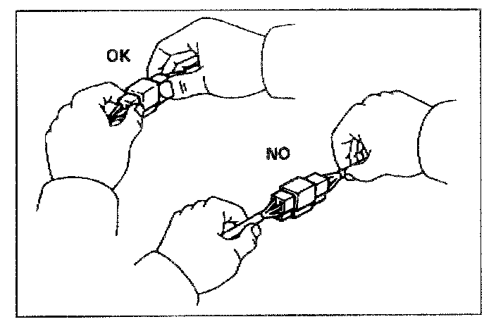 Firmly grasp both sides (male and female) of the connector. Be sure that the connector pins and pin holes match. Be sure that both sides of the connector are aligned with each other. Firmly but carefully push the two sides of the connector together until a distinct click is heard.