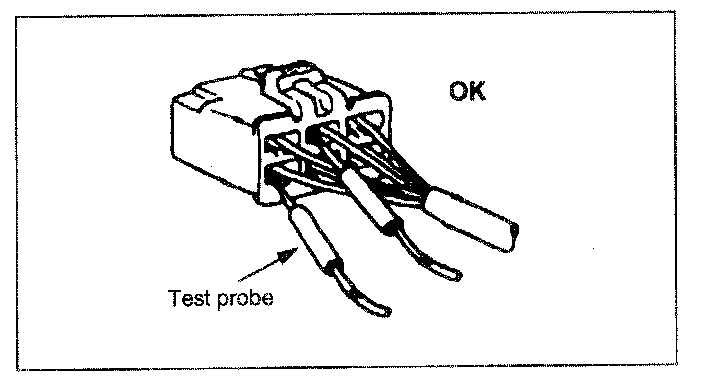 Never insert the circuit tester test probes into the connector open end to test the continuity. Broken or open connector terminals will result.