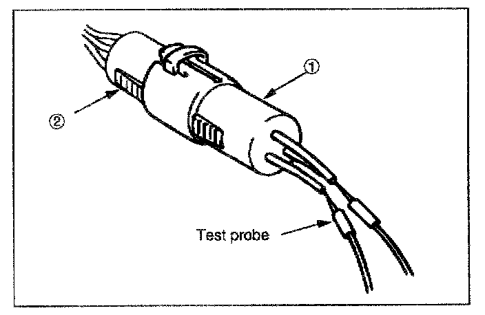 It is not possible to insert the test probes into the connector wire side of a waterproof connector. Use one side of a connector (1) with its wires cut to make the test. Connect the test connector (2) to the connector to be tested. Connect the test probes to the cut wires to check the connector continuity.