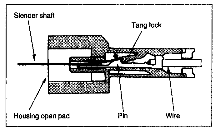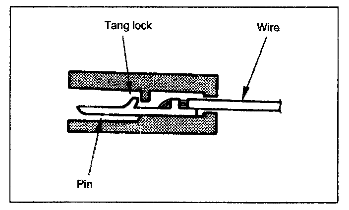 2. Push the tang lock fiat (toward the wire side of the connector). Pull the wire with pin free from the wire side of the connector.