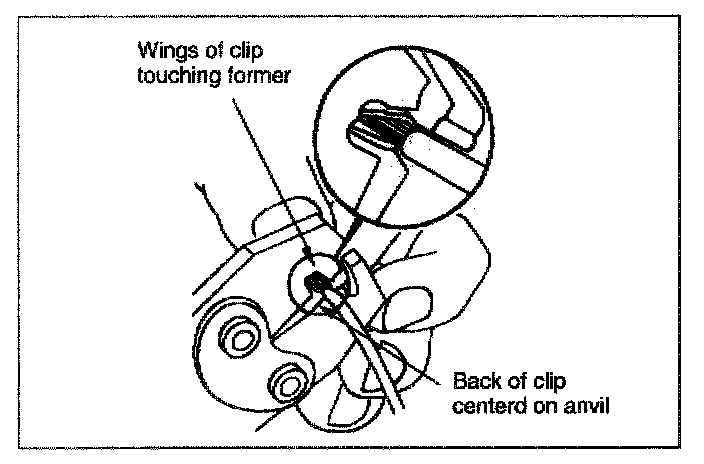 - Center the back of the splice clip on the proper anvil and close the crimping tool to the point where the back of the splice clip touches the wings of the clip.