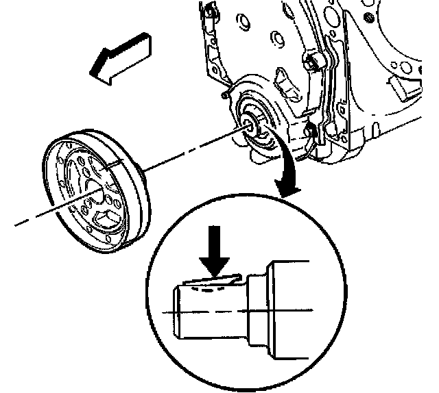2. Apply a small amount of adhesive GM P/N 12346141 or equivalent onto the crankshaft balancer keyway in order to seal the crankshaft balancer keyway and crankshaft joint.