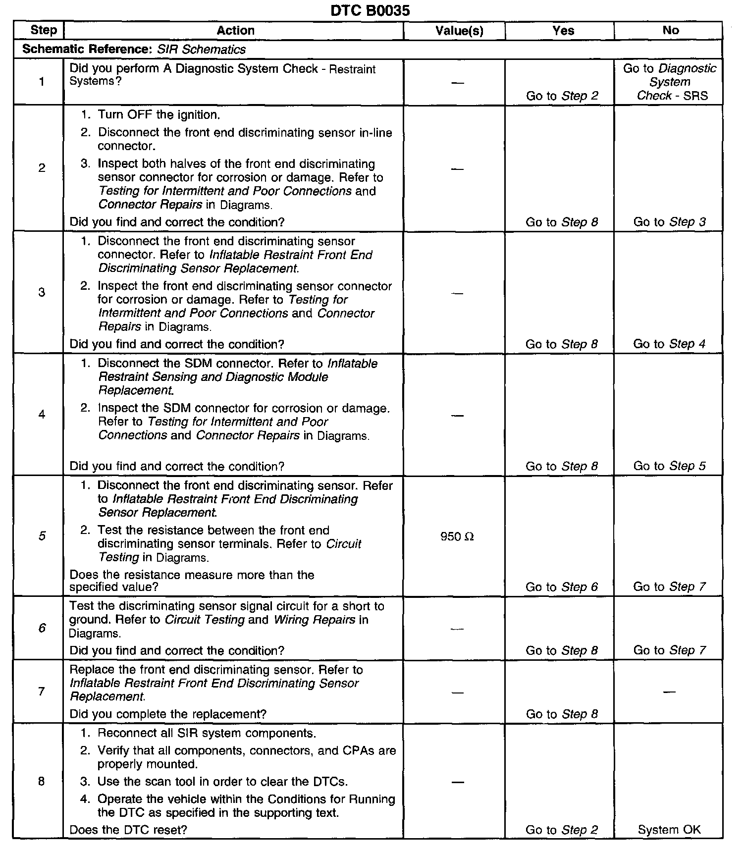 The Inflatable Restraint Sensing And Diagnostic Module (SDM) monitors the inflatable restraint front end discriminating sensor circuit for front impact defection. The SDM processes the signal provided by the front end discriminating sensor to further support deployment of the air bags. The front end discriminating sensor is an input only to the SDM and does not directly cause air bag deployment. When the ignition is turned ON, the SDM performs continuous diagnostic tests on the deployment loops to check for proper circuit continuity and for shorts to ground or voltage. It a malfunction is detected, a DTC will be stored.