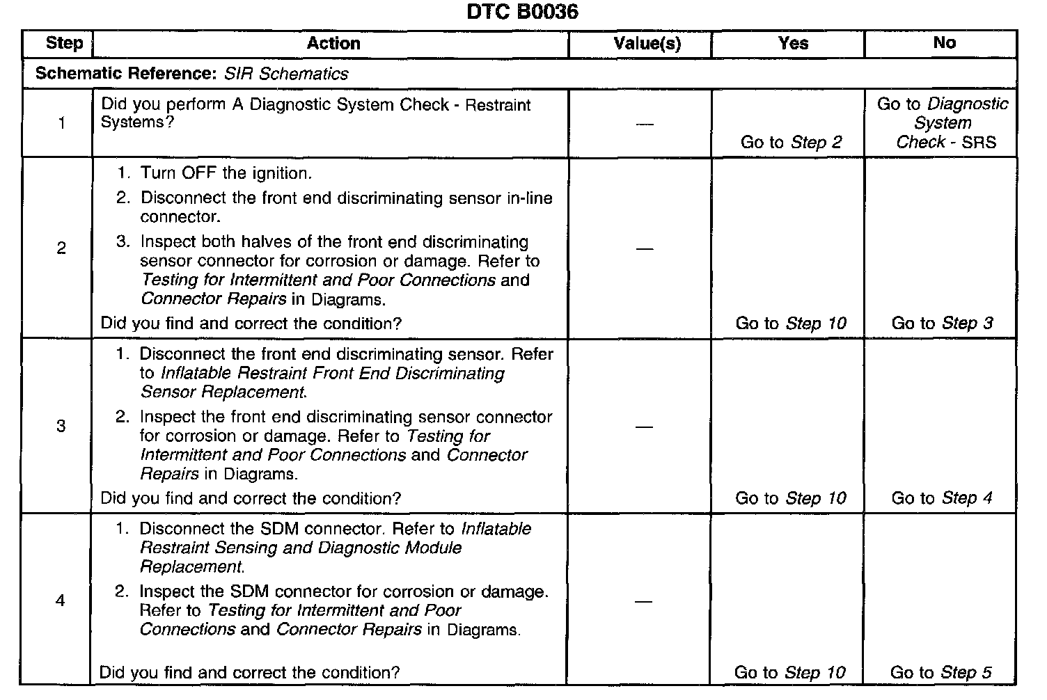 The Inflatable Restraint Sensing And Diagnostic Module (SDM) monitors the inflatable restraint front end discriminating sensor circuit for front impact detection. The SDM processes the signal provided by the front end discriminating sensor to further support deployment of the air bags. The front end discriminating sensor is an input only to the SDM and does not directly cause air bag deployment. When the ignition is turned ON, the SDM performs continuous diagnostic tests on the deployment loops to check for proper circuit continuity and for shorts to ground or voltage. If a malfunction is detected a DTC will be stored.