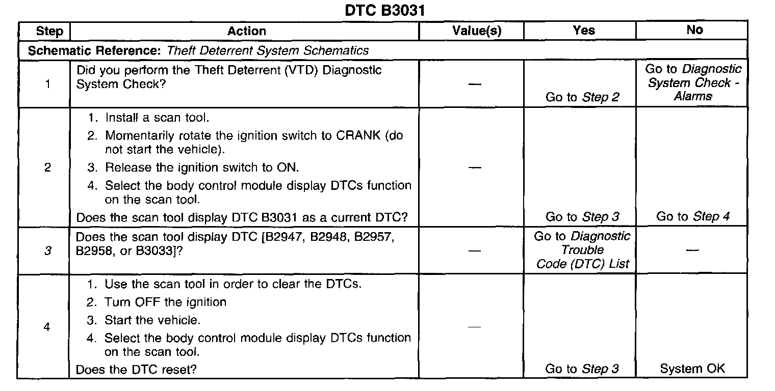 3. Tests for the proper operation of the 12V reference (Security Sensor Power) circuit, sensor ground circuit, and Passlock(TM) sensor signal (data) circuit. Troubleshoot the appropriate DTC prior to diagnosing DTC B3031.