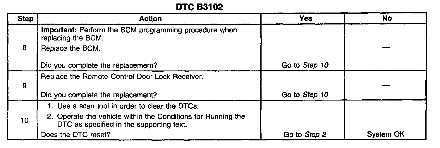 CIRCUIT DESCRIPTIONThe remote control door lock receiver (RCDLR) communicates with the Body Control Module (BCM) through the keyless entry serial data circuit. When any button on the keyless entry transmitter is pressed, the transmitter sends a signal to the RCDLR. The RCDLR sends either a lock or unlock request to the BCM, depending on which button is pressed on the transmitter. The BCM receives the message and performs the appropriate function.