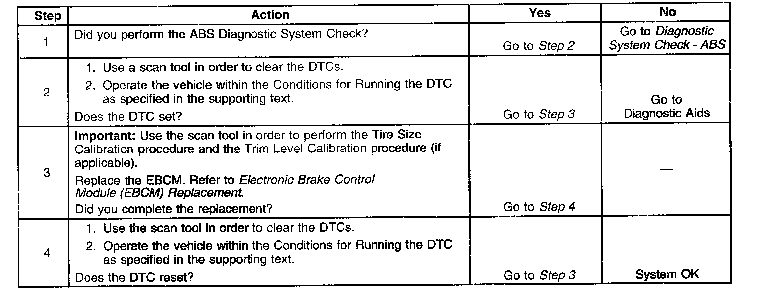 DTC C0241-C0254The ABS relay supplies battery voltage to six valve solenoids (RF dump/isolation, LF dump/isolation, and rear dump/isolation). The EBCM microprocessor applies the grounds needed to activate each solenoid. The low side of each solenoid coil has a feedback circuit to the EBCM microprocessor. When a solenoid is commanded OFF, the feedback voltage is high. When a solenoid is commanded ON, the feedback voltage is low.