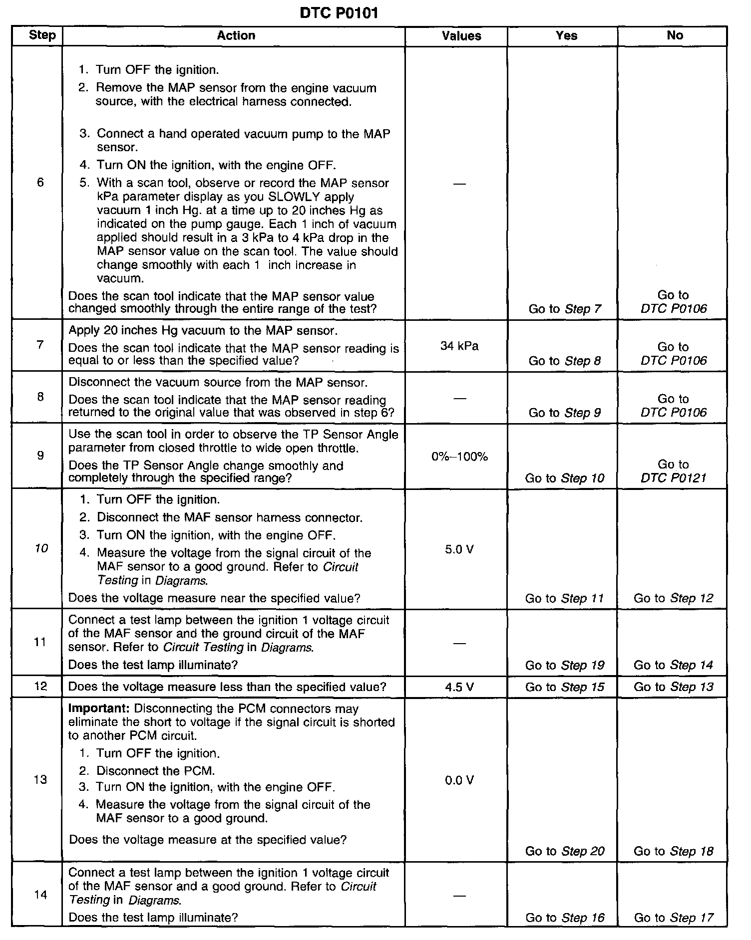 10. This step verifies the signal circuit from the MAF sensor electrical connector to the PCM. A voltage reading of less than 4 volts or greater than 6 volts indicates a malfunction in the wiring or a poor connection.
